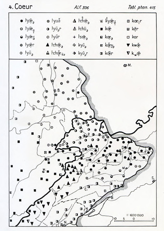 Une des cartes élaborées par Robert Jolidon aux alentours de 1952. Les données du Jura Nord sont principalement issues de relevés personnels, celles du Jura Sud des matériaux écrits du GPSR (RelPhon), et celles de France d’enquêtes par correspondance ou de dépouillements de sources écrites.